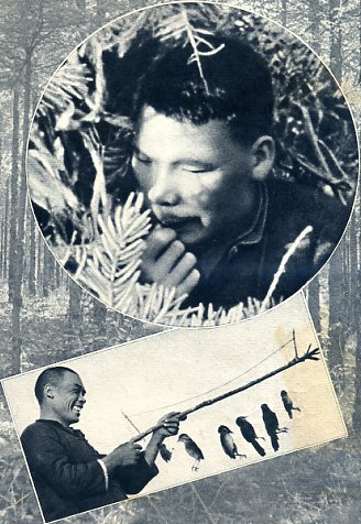 他躲在树丛里发出清脆的鸟鸣,鸟儿就会应声飞来。