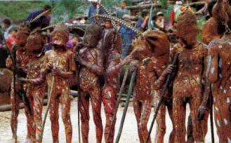 彝族男子绘身。彝族罗罗颇支系自认是虎的后代,每年虎节择男子装扮为虎,举行祭虎祖活动。