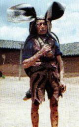 彝族纳苏颇支系举行驱鬼逐疫仪式时由十二个男孩彩绘其身,戴棕皮面具扮演“豹子”,跳“余莫拉格舍”(豹子舞)。