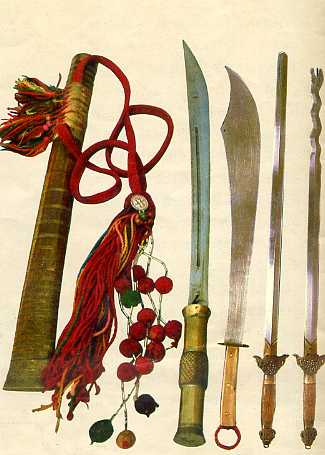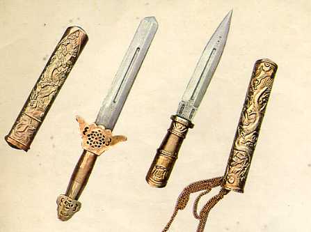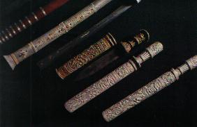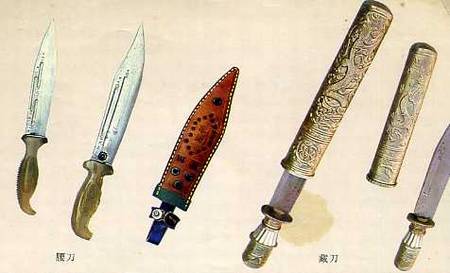 陇川县阿昌族“户撒刀”,工艺独特,质地精良,“柔可烧指,削铁如泥”。品种有长刀、腰刀、匕首、短剑等多种。刀柄刀鞘装饰美观,既是用具、武器,又是饰品。