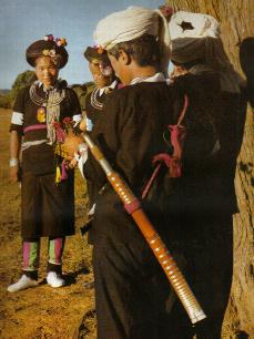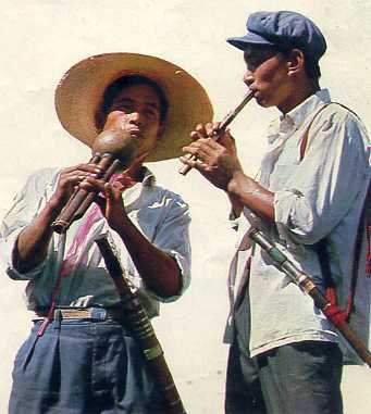 身佩长刀、吹奏葫芦笙和竹萧的阿昌族青年。