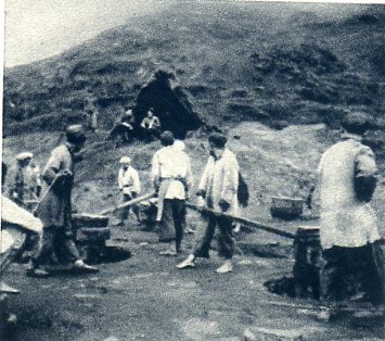 反动政府统治的时候,矿工们在工头的监视下,用推磨把矿石磨细。