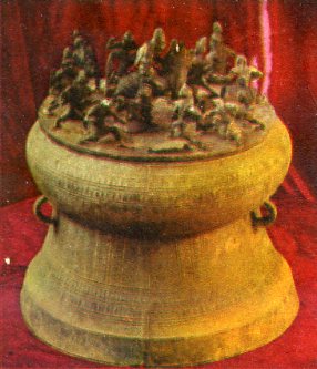 1919年在云南省广南县阿章寨出土的汉代“四船人物大铜鼓”(直径68.5x高47.5cm)。