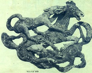 云南省晋宁县石寨山出土的汉代铜器“战争盖贮贝器”。在30公分直径的铜盖上塑有十几名武士,生动地刻划出当时战争的情景。