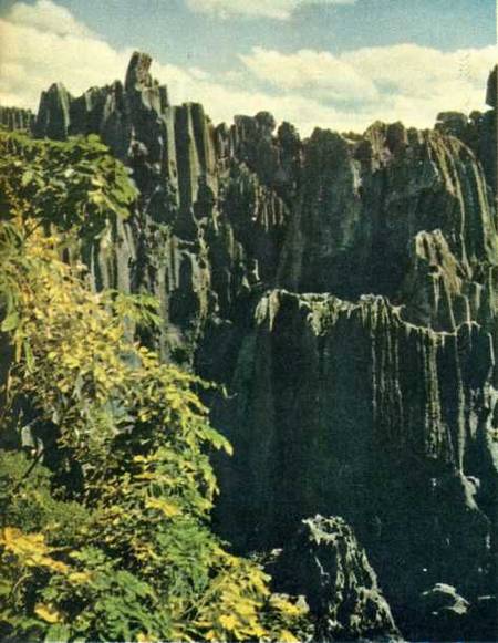 这是石林的“大门”。耸立的岩石上,刻着许多游人的诗词。从岩下经过的,是附近的撒尼族(我国西南少数民族之一)居民。