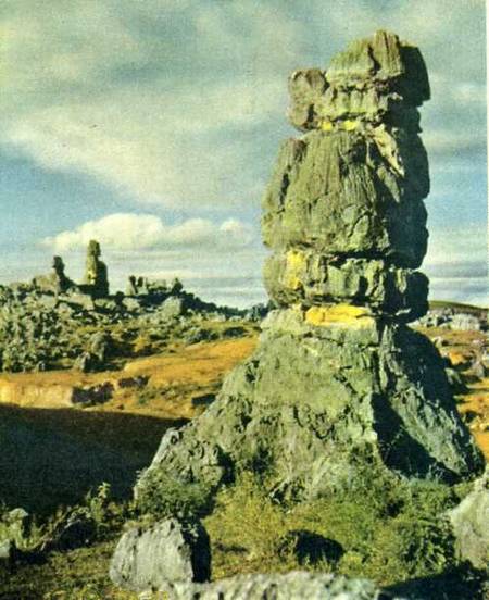 石林在云南省昆明东南100公里,是著名的风景区,附近住着彝支系的撒尼人。