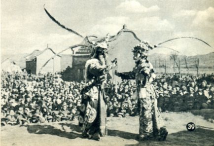 为了开展农村的文化活动,云南省昆明市京剧和滇剧等艺术团体下乡为各族农民作巡回演出。图为京剧团在郊区板桥乡为彝、汉族农民演出的京剧“樊江关”。