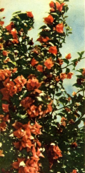 (叶予花)花很小,藏在叶形的鲜红花苞里。这种花昆明非常多,池边、墙角随处都是。艳丽的花枝爬过墙头,行人从花下经过,每有“春色满园关不住,一枝红杏出墙来”的意境。
