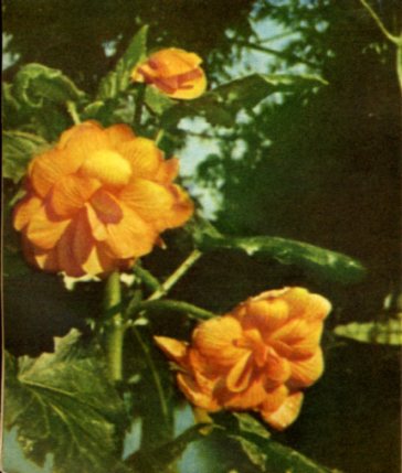 (球根海棠)海棠花的一种,根部成球状,夏日开放。我国海棠花种类很多,宋代诗人韩维形容它说:“谁将法锦翻新样,红绿装成遍地花”。