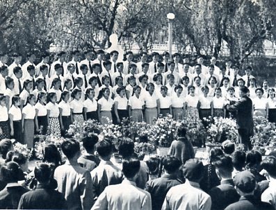 人民音乐家聂耳曾在昆明度过了他的学生时代,图为以聂耳命名的业余合唱团在假日里为群众演唱。