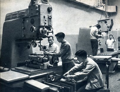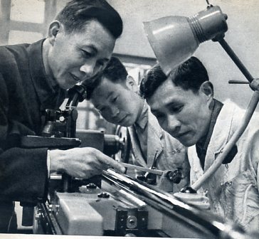用自己制造的高精度刻线机、抛光机,制造最关键的部件—定位刻线尺。这是总工程师陈邦本(左)和老工人纳德正(右)在研究进一步改进刻线机。