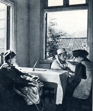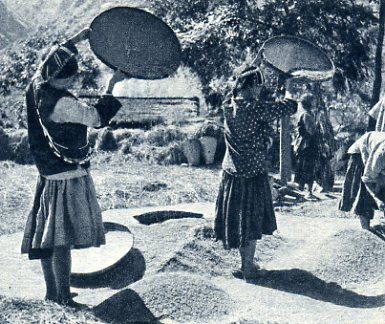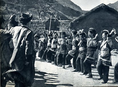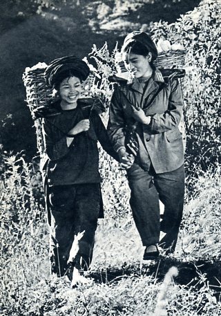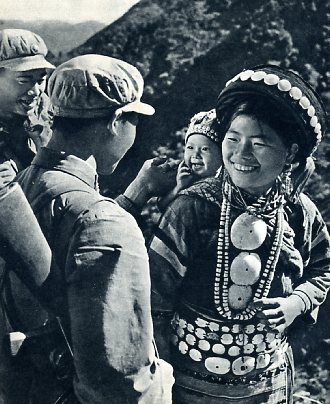 自小当家长奴隶的傈僳族姑娘恰白(右),现在是边防军少尉。她热爱自己的家乡和人民,常常和群众一同劳动。
