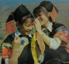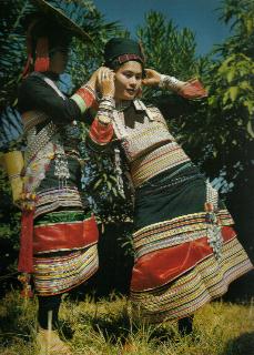 被称为“花腰傣”的元江县傣族女子服饰。她们胸前的塔形银泡饰是吉祥的象征,腰侧精巧的小竹箩既是劳动用具,又是别有情趣的佩饰。