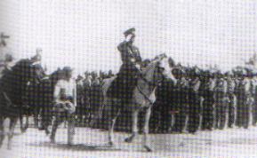 云南行辕和中国远征军长官部于1944年4月30日在保山举行了滇西大反攻动员大会,组织部队开赴前线。图为云南行辕主任龙云(前中)和中国远征军司令长官(左一)在动员大会上检阅部队。