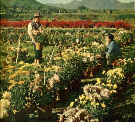 杭州市建设局园林管理处今年栽植数千盆菊花。园里的工人和技术员正在花圃里挑选好花,以供展览。