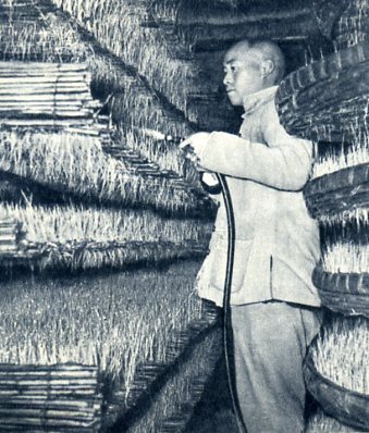 浙江桐乡县大麻人民公社采用蒸汽催芽育秧法培育秧苗,比自然育秧提早20多天。培育时在一间密封的屋子里,把浸过的谷种匀铺在芦帘上,下面不用土和肥料,每隔3小时喷洒一回热水。这样,经过5天,秧苗就可以插到田里去了。(1959年)