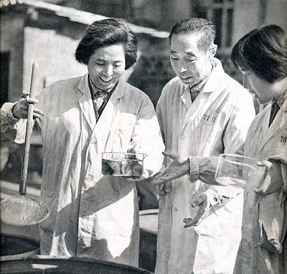 生物学家童第周(中)等在观察实验鱼。