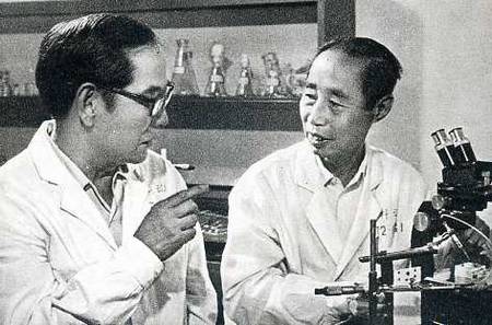 我国生物学家童第周(右)和美国费城坦普尔大学生物系教授牛满江(左)在一起进行科学研究。
