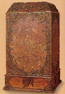 (北宋)堆漆描金舍利函。底宽24.5厘米,高41.2厘米。北宋慧光塔出土。