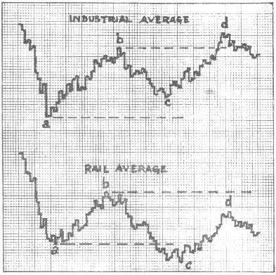 中虚拟的情况为例,在图表上我们假定一轮熊市已持续数月,然后由a到b,是一个次等反弹,工业指数(伴随着铁路指数)上涨至b,然而在其下一个跌势中,工业指数只跌至c,高于c,随之弹升至d,高于b:从这一点看,工业指数已经显示出趋势由跌至涨的“信号”。但我们再看一下这一时期的铁路指数,首先由b至c,低于a,随后由c涨至b。至此,铁路指数与工业指数未能相互验证,因而主要的趋势就仍认为是下跌的。如果铁路指数涨至高于b点的位置的话,我们就得到一个趋势转升的明确信号了,然而,就是在这样一个过程中,由于工业指数不会持续单独上扬,或迟或早总会为铁路指数再次阻碍,机会还是存在的,因而对于这一情况我们充其量只能认为主要趋势的方向还未定型。