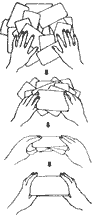 接下来,把牌放在平面上,准备第二种洗牌(见右图).同样的,你的精神仍必须集中把牌以圆圈的方式摊开,并且以两手依顺时秆的方向开始洗牌.一边洗牌时,要一边在心中默述即将推测的问题,以及思考即将采用的牌型.