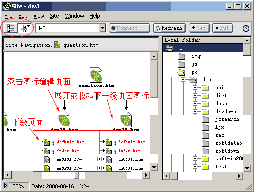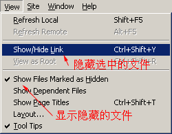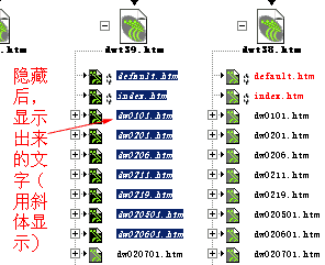 站点结构图以树状结构方式显示了网站中文件的链接关系,结构层次。有些项目子文件过多,显示很庞大,可以点一下主要文件前的减号,子文件就不显示了,同时减号变成了加号,这时再单击加号,子文件恢复显示,是不是和资源管理器差不多。 在站点结构图中可以选择多个网页,打开并编辑网页,建立网页间的链接或改变网页标题。如果要向站点结构图中增加一个已有文件,可以选择“Link to Existing”命令,在弹出的对话框中选择已有文件,按“Select”按钮,文件就加到网站中了。如果想打开这个文件编辑一下,就双击它,这个文件就打开了。 图2 站点结构图 在站点结构图中,默认状态下文档图标下显示的是文件名称,这不利于识别文件内容,也不便于管理文档,这时我们可以显示各页面的标题。选择“View”菜单下的“Show Page Titles”,图中显示了各个文件的Title,并且可以很方便地修改标题内容。选择某一网页,单击网页标题,标题变为可编辑状态,直接输入新的标题即可。 如果想只显示网站中的骨干文件,不显示次要文件,以便突出网站的主要结构时,这个功能就很有用了。比如在当前站点结构图中,想把三级文件隐藏,可以借助CTEL键将其一一选中,然后选择“View”菜单下的“Show/Hide Link”命令,所选文件就在站点结构图中消失了。 图3 隐藏文件 别害怕,这些文件并没真的消失,如果想看这些隐藏文件,可以选择“View”菜单下的“Show Files Marked as Hidden”命令,看,隐藏文件以斜体字显示出来了。  图4 隐藏文件以斜体字显示出来了 站点结构图还可以作为图形文件保存起来,然后在图形编辑器中编辑,选择“File”菜单下的“Save Site Map”,输入一个文件名,站点结构图就被存为一个Bmp图片了。 上一节 下一节  谈谈您的看法 |