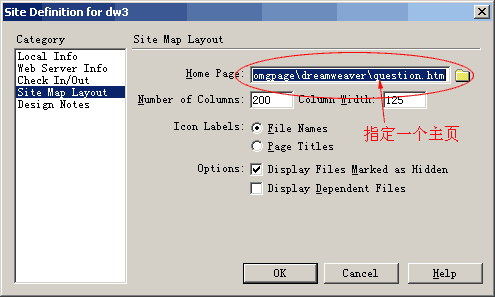 | 站点管理 (2)站点结构图的使用 点一下工具栏上的“Site Map”按钮,会显示站点结构图。 在打开站点结构图时,必须为其指定一个主页,如果没指定,系统会默认为根文件夹下的index.htm为主页。指定主页的方法为:选择“View”菜单下的“Layout”,打开站点定义对话框,在Home Page文本框中可以输入主页文件名。我们就选择D:\myweb\index.htm为主页文件。