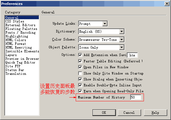 轻松掌握网页制作 深入学习和使用 高级使用和理解 站点管理 发布网页 样式表编辑 Timelines Behaviors Template Library HTML源代码编辑器 强大的查找替换功能 历史面板的应用 附录 常见问题汇总 快捷键分级介绍 一句话技巧集萃 功能快速索引 | | | | | | | 历史面板的应用 (1)一次撤消多步操作 大家都知道,如果在文档中进行了误操作,可以按Ctrl+Z键撤消这些操作,但这样只能一步一步地撤消,有什么办法能将文档恢复到以前的某一步操作呢? 按下F9键,看,这就是Dreamweaver 3新增的历史面板(History palette ),这是从PhotoShop5学来的,面板中显示了我们创建或打开当前文档后所完成的所有操作步骤。利用历史面板,我们能够一次撤消很多步操作。下面我们看一下如何用历史面板撤消操作。在历史面板上,找到希望撤消的最后一步,拖动滑块到这一步所在的位置,也可以直接单击该位置列表左端位置,这时滑块会自动跳到该位置上。可以看到,这时文档窗口中自动恢复到撤消操作后的状态,同时历史面板中被撤消的操作列表会变为灰色。如果希望恢复这些操作,可以重新将滑块拖动到该步骤上,这时被撤消的操作又会被恢复。  图1 历史面板 注意:一旦撤消了多步操作,然后又进行了新操作,则原先被撤消的操作就不能再恢复,历史面板中被撤消的操作列表会消失,并列出新的操作步骤。 当然你不可能无限制地撤消操作,在历史面板中可撤消的操作步骤是数的。按下Ctrl+U,在左侧列表中选“General”,看,对话框最下面标明最多可撤消的步骤数为50,你也可以根据需要自己设定,比如改为100,就可以撤消100步了。  图2 设置历史面板最多能恢复的步数 下一节  谈谈您的看法 | | | | |