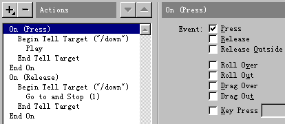 | 5)新增Movie Clip:text down。复制Movie Clip:text up,并命名为text down。更改第二个关键帧的Action为:Set Variable:"/:text.scroll"=/:text.scroll+1。即执行到第2格时,会告知场景上的Text Field(变量名为text)目前所显示的行数往下移一行。  6)安排电影场景: a 此例中有一块白色的区域是Text Field大小的范围,在上面还有一段文字“FLASH十全大补”。 b 放置Text Field:放置一个Text Field在白色区域的上面,设定变量名称为text。  c 将text up导入场景并定义实体名字为up;将text down导入场景并定义实体名字为down。  d 导入按钮:导入两个按钮btn_arrow,一个箭头朝上,一个箭头朝下。  e 设定箭头朝上的按钮的Actions为如图所示: 即表示按下按钮时,会告知text up播放,放开时,会跳回第1格并停止。  f 设顶箭头朝下的按钮的Actions为如图所示: 即表示按下按钮时,会告知text down播放,放开时,会跳回第1格并停止。  g 设定场景Actions为:Load Variables("text.txt",0)。即表示把变量载入到电影的场景里。  7)选择菜单Contrl->Test Movie,即可测试所制作的电影。 |