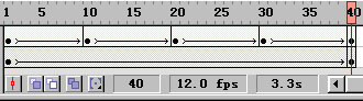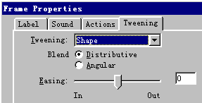 6)点击等时线窗口左下角的增加图层按钮 ,增加一图层Layer 2。选择工具栏中的文字工具 ,将文字的颜色设置成红色,字体类型设置成Arial Black,字体大小设置成130。在工作区中的适当位置点击鼠标并输入字母“A”。  7)选择菜单Modify->Break Apart,  将字母“A”打碎。  8)用同样的方法分别在第10帧、第20帧、第30帧处插入关键帧,输入字母B、C、D并将其打碎。在第40帧处插入与第一帧相同的关键帧。  9)点击Layer2图层的名称,将Layer2图层所有帧全部选中。用鼠标右键点击从第1到40帧中的任意一帧,从弹出的菜单中选择Properties项,弹出帧属性对话框,选择Tweening选项卡并设置其参数为如图所示。   10)为了使每一字母变形前有停顿,调整程序为如图所示。  11)选择菜单Contrl->Test Movie,即可看到字母变形的动画效果。 |