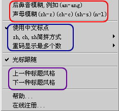 | 拼音加加输入法 |  | | 一.安装 二.功能介绍 三.属性设置 四.定制个性化词库 | | | 常见输入法介绍 | 三、属性设置 您还可以对拼音加加的属性进行一些设置,左键单击> 图案,弹出属性设置框(如右图); 在红色框的部分主要是为了有方言的人(主要是针对南方口音)设置的,在这里您可以设置“后鼻模糊音”和“声母模糊音”; 在蓝色框的部分您可以设置是否使用中文标点、“zh,ch,sh”的简拼方式、重码显示的个数是三个还是五个; 在紫色框的部分是来设置标题风格的;点击“上一种标题风格”会使标题图案变成 ,拼音加加提供了多种方案,您可以把它变成您喜欢的风格;比如象 这样的图案,您喜欢吗?还有很多,您自己试一试吧! 上一页 下一页 | | | |