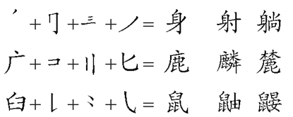 | 二、 怎样拆分汉字 9.常见部首的拆分 [小博士] 下面我们讲汉字中一些常见部首的拆法。这些部首都很常用,但在五笔中没有被列为字根,比如“犭、礻、衤、革、骨、黑”等,所以我们有必要单独讲一下。 [晓 宇] 的确,在拆字过程中经常要用到这些偏旁。 [小博士] 我们先来看反犬旁,在五笔中,没有把“犭”当作独立的字根,而是把它拆成了“ 、丿”。  比如“狼”,就可以拆为“ 、丿、丶、 ”,编码QTYE。这样的字很多,如“狗、猫、猴、犯、猜”等。  [晓 宇] 噢,很多动物名都要用到这个偏旁。 [小博士] 在汉语中,由示补和衣补组成的字也很多。五笔中,把示补少个点当作字根,这样示补等于这个字根加个点,衣补等于这个字根加两个点。 [晓 宇] 那示补的编码就是PY,衣补的编码就是PU喽? [小博士] 不错。我们看个带示补的例子,比如“社”,编码为PYFG,再比如“神、视、礼、祝、祸”等。  带衣补的例子,比如“被”,编码为PUHC,类似的字还有“补、初、袖、裤”等。  [晓 宇] “衬衫、被褥”也都是! [小博士] 你说得很对! 还有一个部首要注意,就是“ ”,它可以看成是一撇和一个提手组成的,千万不要把它当“牛”字来拆。  比如动物的“物”字,可以拆分成这样,编码为TRQR。类似的字还有“特、牡、犍、牲、犒”等。  [晓 宇] 噢,原来是这样! [小博士] 下面我们再看,这是一些偏旁的组合及例字。你把各个组合偏旁的编码说出来。 [晓 宇] 我来看一下。噢,“ ”是QN,“走”是FH,“足”是KH,“舟”是TE。  [小博士] 嗯,不错,你再看看下面这些。 [晓 宇] 噢,原来F键中的这个偏旁是用来组成“革”字的,那“革”的编码就是AF,“骨”是ME,“鱼”是QG,“酉”是SG。  [小博士] 看,还有一些偏旁是由三个或三个以上字根组成的。 [晓 宇] 哦,“黑”是由三个字根组成的,编码是LFO,“鬼”是RQC,这个字根是VFH。“身”是由四个字根组成的,编码TMDT。“鹿”是YNJX, “鼠”是VNUN。  [小博士] 好,掌握了这些偏旁的拆法,输入应该没什么问题。我们还有一些偏旁没有讲,比如“耒、殳、鼻、龙、豸”,你可以根据刚才所讲的,对它们进行拆分,并且多做些练习。 [晓 宇] 好的。 练习:根据已有的偏旁拆分提示,写出下列字的编码,编码要写全。 提示:  例字: 栽 截 彩 菜 蛋 楚 决 块 颇 被 海 姆 狼 食 帮 寿 答案: FASI FAWY ESET AESU NHJU SSNH UNWY FNWY HCDM PUHC ITXU VXGU QTYE WYVE DTBH DTFU 上一页 下一页 返回到首页 |