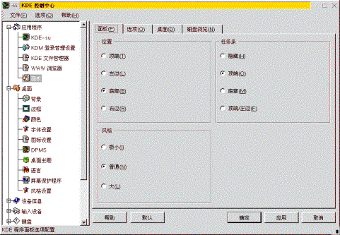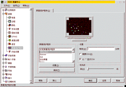 | 4.4 选择颜色主题和背景 桌面配置部分决定了你所希望的桌面外观,在KDE里你能为你的图形环境选择许多种不同的背景颜色、墙纸图形和窗口颜色主题的一种。 注意:颜色、屏幕保护和其它信息的设置被保存在你的主目录里。如果别的用户登录到你的Linux 计算机并启动KDE,该用户将不能使用你的桌面设置,KDE的默认将一直起作用,直到它们被改变,而不是对整个计算机系统起作用。 本节所描述的特点可以通过选择主菜单里的设置|桌面项|,或者使用控制中心的桌面部分(从主菜单中选择KDE控制中心)。KDE控制中心显示在该图形界面中。 如何选择背景颜色 1. 从适当的面板图标中打开KDE控制中心,或从KDE主菜单中选择它。 2.选择控制中心的桌面部分的背景项(图4-5)  图4-5 你能在背景标签上逐个的设置每一个KDE虚拟桌面的外观 3.为之设置的背景颜色的桌面。 每一个桌面可以有不同的背景颜色和/或墙纸。 4.选择单色按扭,设定单色背景。 5.选择双色单选按扭来选定双色(渐变的或阴影的)背景。 6.点击任何一个或两个颜色条来设置该条的颜色。 一个选择颜色对话框将被显示(见图4-6),在这里你可以选定系统颜色的一种,或者定义你自己的用户色彩。  图4-6 该选择对话框将会在整个KDE中使用以帮助你为一个对象选择颜色 7.如果你选择了双色背景,那么选择设置按钮来选定两种颜色混合的方式(见图4-7)。  图4-7 在设置对话框中,你将定义如何混合两种颜色以创建一个KDE背景 注意:当你选择颜色和背景时,该对话框右上角处的预览窗口将显示桌面将会是什么样子。 如何为你的桌面墙纸图形 1.选择你想为之选定墙纸的桌面。 2.在桌面区的背景标签里找到对话框墙纸部分。 3.从最初显示"无墙纸"的下挂列表中为你的墙纸选定图形。 KDE包括了近100幅墙纸图形,如果你没见到你想要的墙纸,选择浏览按钮来选定你所创建或下载的图形作为墙纸。 注意:墙纸可以以多种标准的图形格式创建,包括xpm、jpeg和gif。 1.选择你所希望从下挂式列表中放置墙纸的方式。 例如,聚集在屏幕中间或平铺在整个屏幕上,你的选择依赖于你决定的图形风格。 2.选择应用来激活你的设置。 3.选择文件或退出来关闭KDE控制中心。 选择屏幕保护 当你使你的计算机闲置一旁时,屏幕保护可以启动防止显示器受损。KDE包含有许多屏幕保护程序,你能利用标准对话框选择并测试它们。 注意:因为一些显示器在无动作时适应于节能模式,所以你或许只有在测试时才能看到这些屏保程序。即使它看起来并不好看,但是它是一种节能的显示器使用方式。 如何选择KDE屏幕保护程序 1. 选择 设置|桌面|屏幕保护(或选择KDE控制中心里的桌面|屏幕保护区域)。 屏幕保护程序选择对话框出现(见图4-8)。  图4-8. 在屏幕保护对话框中,你可选择和配置KDE的屏幕保护程序 1.从屏幕保护程序的下拉列表中,选择你想适用的一个。 KDE 包含有许多屏幕保护程序。 2. 选择Setup按钮来设置屏幕保护操作。 例如,你可设置多少对象显示,或他们的移动速度。 每一个设置对话框都不同,依赖于你所选定的屏幕保护程序。 3.选择测试按钮来看一下屏幕保护程序被激活的情况。 移动鼠标或按下esc键结束测试。 4.在Wait域中,输入一个延迟秒数来决定在运行屏幕保护程序之前的等待时间。 5.如果你想给你的屏幕保护程序加锁,请选择Require Password 检查框。 当你离开办公桌,而你的屏幕保护程序运行时,这个选项将会屏蔽别的用户。 6.移动优先级滑动块来显示屏幕保护程序的优先级。 如果有其他程序运行,比如 spreadsheet recalculation, program compilation, 或database accesses请使用低优先级.屏幕保护程序的图形应是起伏的,但你的其他工作会有优先级。 7.选择OK 来设置屏幕保护。 设置桌面元素的大小和位置 许多KDE桌面元素能被设置成适合你的个人风格。例如,你能选择面板和任务条的大小位置。 如何选择面板和任务条的大小和位置 1. 选择KDE控制中心的应用程序区的面板(或 选择 主菜单上的设置|应用程序|面板)。 2.选择"面板"标签。(见图4-9)。  图4-9. 利用这些KDE控制中心功能设置面板和任务栏的位置 3. Location 区,选择你所希望的面板位置。 4.在Style 区,选择你所希望的面板图标。 小图标适合于低分辨率。(800*600) 普通和大图标使用同一个图标,但是大的将其放在一个更大的框里,这对于高分辨率将会是非常方便的。(1600*1200)。 5.在Taskbar 区,选择你希望的桌面任务栏位置。 如果你选择了Hidden,任务栏将不会显示。你仍可以使用ALT+TAB ,或窗口列表来切换。 6.如果想是面板或任务栏自动隐藏,改变Option标签。(见图4-10)。 当你不使用它们时,"Autohide 功能将把面板和任务栏移出。 当你把鼠标指向屏幕边缘时,他们又会出现。  图4-10. 在Option标签上设置面板和任务栏如何动作 7.在对话框的可视区里,选择AUTO HIDE PANEL 或 AUTO HIDE TASKBAR 去执行这些特性。 8.使用滑动块来决定当你移离面板和任务栏时,自动隐藏特性被激活的速度。 9.不选Tooltips菜单里的Show Menu Tooltips检查框,可以防止黄色弹出线索显示在面板图标和菜单项上。 在你还未熟悉KDE的图标和菜单项前使用菜单Tooltips非常有用。 介绍XteamLinux桌面图标 在安装XteamLinux3.0后启动X-Window时,你将看到桌面上有一些图标,它们是:我的电脑、我的因特网、我的办公室、我的多媒体、我的工作室、我的配置、回收