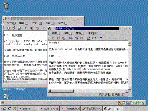 | 5.13 XteamLinux3.0中文化的新特性 5.13.1 多国语言支持 5.13.2 TureType字体引掣 5.13.3 智能化Samba 为了适应国际化标准,Xteamlinux 3.0在XteamLinux简体中文版2.0的基础上,新增了大量创新技术和对国际化、多语种应用环境的全面支持。其强大的系统性能足以担当PC工作站、高级开发平台和个人网络服务器的重任。 5.13.1 多国语言支持 在XteamLinux3.0中,系统中内建了多国语言扩充的API接口,你可以根据个人需要和应用环境自行扩展。 举例:你现在想使用的应用软件是韩文或日文的,那么你可以编译你所想使用的软件的语言内码,在使用该应用软件时,将当前语言内码设置为韩文或日文就可以了。 在X Window下可以同屏多内码显示,支持多国语言的动态切换。 举例:台湾用户在使用XteamLinux3.0简体中文版时,如果想编辑文本或输入文字时,希望看到的是繁体文字,那么你只需要在设置内码处,点击“大五码(BIG5)”就可以了,想切换为显示简体文字,点击“国标扩展码(GBK)”。XteamLinux3.0还可以在同屏显示多种不同的内码。如图:5-35所示。  图5-35 同屏多内码显示 XteamLinux3.0是真正的内核汉化,支持GBK Big5。在文本终端下,如果你想查看简体中文内容或大五码内容已不再是难事。XteamLinux的文本终端分为六个你可以用Alt+F1、F2、F3、F4、F5、F6来切换。你可以设置每个终端的内码以适应你的需要。 设置方法: 转换为GBK字库,在#提示符下输入:setcode gbk 转换为Big 5字库,在#提示符下输入:setcode big5 转换为GB2312字库,在#提示符下输入:setcode gb2312 5.13.2 TureType字体引掣 XteamLinux3.0中增强的TureType字体引掣,具备了处理黑体、斜体等多种字型的功能,全面支持中文字体的无极缩放。 以前在编辑文本的时候,你会发现字体是无法改变的,不能设置为黑体与斜体。在这个版本已经解决了这个问题,你可以在LyX下试用这个功能。如图5-36所示:  图5-36 设置字体 如果你用过以前的版本也许你会发现,你设置的字号不存在的话,那么将显示的是缺省的字号,现在的XteamLinux3.0版本,可以根据你的需要任意设置字体大小了,图5-37所示的是在Gimp中,字体的无极缩放。  图5-37 字体的无极缩放 5.13.3 智能化Samba 用过Windwos的用户应该对“共享”这个词不陌生吧,它是通过局域网达到共享一个文件的目的。XteamLinux3.0中的“Samba”也是这种功能。它的操作习惯也与Windows是大致相同的。在KFM(文件管理器)中,点击你想要共享的文件,然后点击鼠标的右键,在弹出的菜单中,选择Samba,出现如图5-38所示对话框。  图5-38 Samba配置 点中“共享为”,填入共享的文件名和对文件的说明。 选择访问类型,访问类型分为三类:只读、完全、根据用户名访问。 如果你选择的是根据用户名访问,那么你需要填写用户权限。  谈谈您的看法