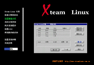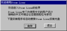 | 2.3 直接用光盘安装 如果你的计算机具备从CD-ROM启动的能力,从CD-ROM启动安装是最直接的方法。 请你按以下步骤执行: 1.将光盘插入光盘驱动器。 2.启动计算机。 屏幕如图2-1所示:  图2-1 欢迎使用XteamLinux 按Enter键或用鼠标单击继续,(XteamLinux安装程序支持键盘操作,所有基于鼠标的操作都可以通过按Tab键或-,ˉ箭头移至相应的位置和space键(即空格键)完成,以下仅叙述鼠标的动作。安装程序将自动搜索XteamLinux安装光盘。 如果安装程序没有检测到XteamLinux安装光盘,屏幕将会如图2-2所示:  图2-2 无法检测光驱 提示:这种状况可能是由下面两种原因造成的: Ø 光盘驱动器没有准备好 系统提示你再一次检查设备,鼠标单击确定,系统将进行再一次的检测。 如果你的光盘驱动器为普通的IDE类型的CDROM,安装程序会检测到XteamLinux安装光盘。屏幕出现XteamLinux安装程序的界面。 Ø 你的光盘驱动器接口是SCSI类型的或特殊类型的。 这时用鼠标单击放弃,你会看到如图2-3一样的屏幕显示:  图2-3 装载SCSI类型的CDROM驱动 表单上列出了一些SCSI适配器的型号,选中相应的CD适配器型号,用鼠标单击装载,系统将自动装载你的CDROM的驱动程序。 屏幕提示如图2-4:  图2-4 CD ROM驱动程序参数 填入你的接口卡参数,鼠标单击确定。 在XteamLinux3.0是一个国际化版本,它有两种不同的语言环境,一是简体中文语言环境、二是繁体中文语言环境。当开始启动安装程序的时候,首先出现的是如图2-5所示的选择系统语言的界面:  图2-5 选择系统语言 在这一步,你可以根据你的需要选择安装系统所用的语言,如果你选择了简体中文,那么在将来的使用过程中,系统所出现的一些提示与菜单等都将是简体字,相反,则将是繁体字。 之后屏幕出现XteamLinux安装程序第二部分的界面,你看到的安装程序的界面如图2-6:  图2-6 XteamLinux安装界面 屏幕的左边是状态栏,它会告诉你现在安装程序进行到了哪一步。右边是信息栏,你按照它的提示一步步做下去,就可以成功的安装XteamLinux。 下一节  谈谈您的看法