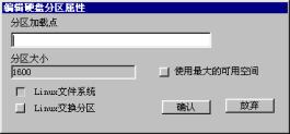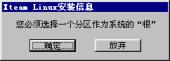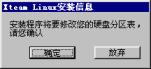 | 2.5 硬盘分区 2.5.1 硬盘分区 2.5.2 选择交换分区 2.5.3 格式化硬盘 你接下来会看到如图2-9一样的硬盘分区信息:  图2-9 硬盘分区 如果你对Linux的分区情况不甚了解,即使看了如下的介绍也不能正确分区,那么请按“提示”按钮,系统会根据你硬盘的情况自动分区,这时你只需单击“下一步”即可。 注意:你在这一步所做的工作其实并没有写硬盘,直到系统提示你“安装程序将要修改您的硬盘分区表,请您确认”,你都可以更改你的决定。 2.5.1 硬盘分区 首先进行硬盘的分区,这时屏幕上已经显示出你机器硬盘当前存在的每一个分区的情况,你可以根据你的想法删除分区、编辑这些分区或增加新的分区。 1.删除分区: 鼠标单击删除分区,屏幕提示如图2-10:  图2-10:删除分区 如果确定删除该分区,鼠标单击确定,否则放弃。 注意:确定此分区的程序和数据已经进行了备份! 直到系统提示将要修改你的硬盘分区表之前的操作是没有实际写硬盘的,如果你误操作删除了某个分区,还是可以恢复的。 2.编辑分区: 鼠标单击编辑分区,屏幕提示如图2-11:  图2-11 编辑硬盘分区属性 在分区加载点下填入你想加载的名称,例如:/usr,鼠标单击确认。 3.增加分区: 鼠标单击增加分区,屏幕提示如图2-12:  图2-12 增加硬盘分区属性 填入分区加载点,例如:/home; 填入分区大小,如:100(注意:不要填单位); 选择增加的分区是“Linux文件系统”还是“Linux交换分区”。 鼠标单击确认。 提示: (1) 必须选择一个分区做为系统的“根”,即必须有一个分区的加载点为“/”。如果你没有选择,屏幕将会出现如图2-13的提示  图2-13 系统的“根” (2)必须创建Linux交换分区,且最大为127M,如果你创建的交换分区大于这个数值,安装程序将修改你所请求的分区尺寸,屏幕提示如图2-14:  图2-14 交换分区 通常只需建立一个交换分区即可,而且由于各种硬盘的参数不同,会出现交换分区的最大值只能为125M或其它略小于127M的数值,出现这种情况是正常的。 (3)如果你选中了“使用最大可用空间”选项,那么你在“分区大小”中所填入的数值其实是分区的最小值,在创建分区时系统会将剩余的空间都分给此分区。如果再创建的分区仍然使用了这个选项,系统会根据这两个分区最小值的比例自动分配空间大小。 (4)推荐一种最简单的分区。先选择交换分区,大小为127M,再选择文件系统,加载点为“/”,点中“使用最大的可用空间”,这样系统将剩余的空间全部留给Linux文件系统。如果你是一个新手,对Linux的各种分区还不太熟悉,那么就使用这种方法吧。 完成的分区表看起来是这样的,图2-15所示:  图2-15 硬盘分区表已经做好 当你确定你的分区表已经做好,鼠标单击下一步。 此时安装程序提醒你,如图2-16所示:  图2-16 确认分区表 单击确定之前系统其实并没有写硬盘,你可以更改你的决定,鼠标单击放弃退回到硬盘分区的对话框。 2.5.2 选择交换分区 选择交换分区的屏幕提示如图2-17:  图2-17 选择交换分区 如果“选择按钮”被选中(屏幕显示为绿色),则表示系统应使用该交换分区。 通常只需建立一个交换分区即可。 注意: · Linux目前交换分区最大为127M。由于各种硬盘的参数不同,会出现交换分区最大只能为125M,或其它略小于127M的数值,这是正常情况。 · 选择安装分区时自动检查硬盘坏道,强烈建议选中“检查硬盘坏块”。 如果你创建了多个交换分区,或系统中存在多个交换分区,请选择一个或多个作为交换分区,鼠标单击下一步。 2.5.3 格式化硬盘 屏幕提示如图2-18:  图2-18 格式化硬盘 如果“选择按钮”被选中(屏幕显示为绿色),表示需要格式化该分区。 注意: 强烈建议你格式化以下分区: /,/usr(如果建立),/var(如果建立)。 如果安装中出现意外死机或退出等现象,选中“检查硬盘坏块”。 如果你想同时检查硬盘坏道,点中“检查硬盘坏块”选项。 鼠标单击下一步。 这时,安装程序开始拷贝系统程序,这大概需要十几到几十分钟不等,视你的机器的情况而定。 注意: · 如果没有格式化/usr分区(或根分区),安装时间会大幅延长。 · 另一种情况是内存较小,如小于8M,这也会造成安装时间过长。 在屏幕的右边的画面由三部分组成,如图2-19所示:  图2-19 安装过程 左上方为活动的黄色指示块,由上方是正在安装的软件包,下方是有关冲浪XteamLinux的介绍,你可以在安装过程中就得到3.0新特性。 系统程序拷贝完毕后,你可以创建一张启动盘,屏幕给你的提示图2-20:  图2-20 创建启动盘 我们推荐你创建这张系统盘,并妥善保管。它可以在你的系统出现某些问题时帮助你引导系统,在你还是一个新手的情况下尤其重要。 提示: 如果安装完XteamLinux后,又安装了NT等其它系统,会出现不能启动XteamLinux的情况,此时可以使用启动软盘启动并重新执行LILO。 鼠标单击是,系统提示如图2-21:  图2-21 插入磁盘创建启动盘 下一节  谈谈您的看法