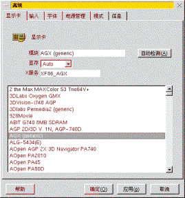 | 2.7 配置系统参数 2.7.1 配置服务器软件 2.7.2 配置鼠标 2.7.3 配置X Server 2.7.1 配置服务器软件 进入配置服务器软件对话框,屏幕提示如图2-26:  图2-26 系统V服务器管理软件 你可以根据自己的实际情况来选择你需要的服务器软件,对话框的右侧有对左侧所列服务器软件的简要介绍。 一般选择默认配置即可,鼠标单击确认。 屏幕显示:服务器软件设置保存完毕 这时按“确定”。 2.7.2 配置鼠标 确定后,计算机器将重新启动,屏幕将出现如图2-27所示的鼠标的配置界面。  图2-27 鼠标的检测结果 图2-28为配置鼠标程序。选择你的鼠标的型号,如果是二键鼠标,移动光标到“[ ]模拟3键鼠标?”,按空格键选中此选项。  图2-28 配置鼠标 图2-29为选择鼠标的端口号,/dev/cau0是DOS下的COM1,如此类推。  图2-29 选择鼠标端口号 注意: 鼠标检测程序有时可能会错误的将MS串口鼠标识别为PS/2鼠标,请注意屏幕提示。 2.7.3 配置X Server 如果你用过以前的XteamLinux的版本,你会发现,如果想配置显示器、显示卡、鼠标等设备,你首先需要进入系统,经过登录、输入命令等步骤,而新的XteamLinux3.0当你配置好鼠标,点击OK键后,将会自动出现一个图形化的配置显示器、显示卡、键盘、鼠标等。 如图2-30所示:  图2-30 X Server配置 配置显示器 如图2-30所示,在监视器一栏的下拉式滚动列表中,选择合适的显示器。 如果你的显示器没有列在这里,选择手工定制或Custom。这时将弹出一个如图2-31所示对话框。  图2-31 定制显示器 选择手工定制的用户一定要知道你的显示器型号,及其相关的参数,否则你可以选择Custom来配置你的显示器。当你选择了手工定制后,你要给出你的显示器生产商、对显示器的描述、以及显示器的垂直同步率、水平频率和最大分辨率。 接下来你将在颜色下拉式列表中,选择你的显示器的彩色模式,某些AGP的显卡目前只能支持8位或16位彩色模式,建议使用16位彩色模式。 你可以在这里配置桌面的大小,并且根据你的个人需要在激活虚拟桌面。 注意:当你配置显示器后,一定要点击“高级”键,来配置显卡、鼠标、键盘等选项,否则X Server将无法启动。 配置显卡 当你点击了“高级”按钮后,将出现如图2-32所示的显卡选择程序画面,表中列出了XteamLinux所支持的显卡。  图2-32 配置显卡 在这个对话框中,你可以先点击“自动检测”按钮,让系统来自动检测。如果顺利的话,它将正确的认出你的显卡;如果不顺的话,你就要自己选择显卡,找出你的显卡的型号。 配置键盘与鼠标 点击高级里的“输入”项,出现的是配置键盘与鼠标的界面。  图2-33 配置键盘与鼠标 根据你个人键盘的情况,选择相应的键盘布局与类型。 注意: 在2.7.2.一节中虽然我们讲述了鼠标的配置,但是在这里一定要重新配置一下。因为在这里的所有配置选项,将生成一个新的配置文件,将你在2.7.2节中的配置内容覆盖,所以如果你没有重新配置鼠标,而默认的选项不附合你的鼠标类型,那么在启动X Server后,将无法使用鼠标。 在鼠标类型列表中选择你的鼠标类型,在设备一栏里,选择鼠标的端口。 如果你的鼠标为2键鼠标,请你在模拟3键的地方打一个勾,然后单击“确定”键。 当你确定你的显示器、显卡以及鼠标等选项都已经配置好后,点击“确定”按钮,系统将在15秒钟内启动测试,并能够看到测试图案。 当测试完成后,将出现一个X服务启动打印信息,只要点击“确定”即可,如果你对测试结果不甚满意,可以重复以上步骤来重新配置。 至此,XteamLinux的安装配置已全部完成,系统将重新启动,进入启动界面。  谈谈您的看法