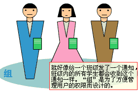 |  谈谈您的看法 | | | | | 本教程来源于《开天辟地II》。 | | ·什么是"组" 在前面我们提到过"工作组"是Windows 2000安全机制的一个部分。那么这个"组"到底是什么意思呢?在什么样的情况下我们会用到组呢? 我们可以把"组"看作是一个班级,用户便是班级里的学生。(如右图)当我们要给一批用户分配同一个权限时,就可以将这些用户都归到一个组中,只要给这个组分配此权限,组内的用户就都会拥有此权限。(如图一) 就好像给一个班级发了一个通知,班级内的所有学生都会收到这个通知一样。 "组"是为了方便管理用户的权限而设计的。(如图二) |  | 图一 | 图二 |  谈谈您的看法 | | | | |