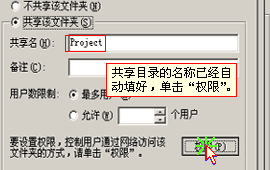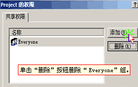 | ·如何设置共享目录的访问权限? 在实际工作中,我们总是希望共享的目录只有部分人可以访问,而且有些人只能看,有些人既可以看又可以修改其中的文件,设置这样比较复杂的共享权限应该如何操作呢? 假如我们要将E盘中的"Project"目录共享,只有"Right"组的成员可以读取,但不能修改,而另外一个用户Super可以对该共享目录完全控制,其他用户不可从网络访问该共享目录。下面我们就来看看如何操作。 还是在"我的电脑"中浏览到E盘,然后选择目录"Project",单击鼠标右键,从快捷菜单中选择"共享"。选择"共享该文件夹",共享目录的名称已经自动填好,点"权限"按钮。(如图一)在默认状态下,"Everyone"组成员对该目录有完全控制的权限,这不符合我们的要求,所以先要将该组删除。点"删除"按钮,(如图二)"Everyone"组便从列表中清除了。然后点"添加"。