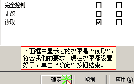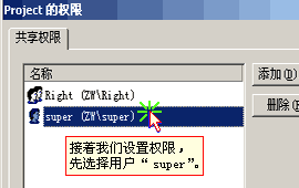 图二 | 图三 | 屏幕上弹出"选择用户、计算机或组"的窗口(如图三),和我们在前面给"组"添加成员时看到的选择窗口基本一样。仔细的观察一下它们又不一样,在上方我们可以从本机或者所在"域"内选择用户,在下面的选择列表中,还可以看到本地已有的"组"。 选择"Right"组,再单击击"添加"(如图四),下面的列表中自动出现Right组,前面的"ZW"就表示该"组"是工作站"ZW"中的。再从上面选择Super,将其也添加到下面的列表中(如图五)。选完后单击"确定"。 图四 | 图五 | 下面我们来设置权限。先选择用户"Super"(如图六),下面的框中,显示出他当前的权限是"读取",这里的"读取"权限包括,查看此目录下的文件名和子文件夹名,进入子文件夹,查看文件中的数据和运行程序。根据前面提到的需求,这里我们选择允许中的"完全控制"。(如图七) 图六 | 图七 | 我们再设置"Right"组的权限,选择"Right"组,在下面的框中可以看到默认的权限是允许"读取",符合我们的要求。现在所有的权限都设置好了,点"确定"结束(如图八)。  图八