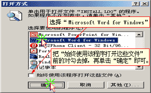在任意一个文本文件上面点右键,在弹出的右键菜单中选择“打开方式”,(见图三)这时会弹出“打开方式”对话框,单击列表框中的“Microsoft Word for Windows”,需要注意的是在应用程序列表框下面有一个“始终使用该程序打开这些文件”的选项,选上这个选项,文本文件的缺省打开方式就会变成Word,不选择这个选项,文本文件的缺省打开方式不会变,而只是在“打开方式”菜单下多出一项“Word”的选项,把这个选项前面的对勾去掉,最后单击对话框下方的“确定”即可。(见图四)