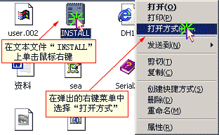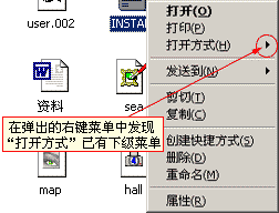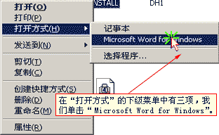 然后在文本文件上点右键,你会发现右键菜单中的“打开方式”选项有了下级菜单,其中有三项,“记事本”、“Microsoft Word for Windows”和“选择程序”,点击“Microsoft Word for Windows”选项,这时Word会启动并打开文档。你还可以通过“选择程序”来选择加入其它的打开方式。 (见图五、图六)