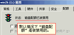 | ·何谓限量使用磁盘空间 如果你使用过NOVELL的服务器,一定记得其中有一项给不同的用户分配磁盘使用空间的设置,这样可以限制一些用户在服务器上复制大量的私人文件。 同样当多个人使用同一台Windows 2000 Professional的电脑时,也会出现因为一个用户占用了大量的磁盘空间,而导致其他用户没有空间保存自己的文件的情况。 于是在Windows 2000中添加了给用户分配磁盘空间的新特性,这个功能简称为"磁盘配额"。 先让我们打开"我的电脑"图标,选择"G盘"(如图一),单击鼠标右键,选择"属性"。在磁盘的属性窗口中可以看到多种维护和设置的功能,最后是"配额"选项卡,现在"磁盘配额"是否已经自动启动了呢?打开"配额"选项卡。 图一 |  图二 | 磁盘配额目前是禁用的(如图二),平时管理磁盘配额都是在这里,需要注意的是,只有采用了NTFS文件系统的磁盘才有磁盘配额功能。(如图三) 图三 |  谈谈您的看法 |
