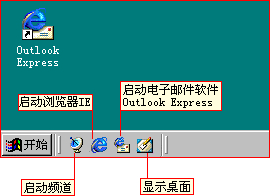 | 6、多功能的任务栏(一) 除了刚才说的变化,Win 98还增强了许多功能。 看,任务栏的“开始”按钮旁边多出了一个比较短的工具栏,里面有几个精致的小图标。这个工具栏叫做“快速启动工具栏”。那么工具栏上这几个小图标都有什么用呢? 首先看那个蓝色的“e”,点一下它就可以启动浏览器IE。IE是微软公司推出的网络浏览软件,Windows 98最大的变化就是把IE集成到操作系统环境中。 这个放着纸和笔的小图标表示桌面,这个图标在你的桌面被各种应用程序的窗口占得满满的时候特别有用,你再也不用只为了点一个桌面上的图标而把打开的窗口一个一个最小化了,只要一点它,我们的桌面就全显示出来了。 另一个图标看起来好象地面卫星接收天线,它是查看频道用的。“频道”就是我们刚才讲的放在桌面上的那些。 如果你不想在桌面上显示频道,那么用鼠标在桌面空白处单击右键,选择“属性”,单击“Web”选项卡。 选中“按Web页方式查看活动桌面”,下面的“Internet Explorer频道栏”缺省情况下是被选中的,单击它,再点“确定”,桌面就又变得干净了。