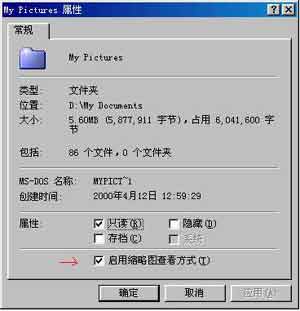 (图1) 在想使用缩略图查看文件的文件夹中单击鼠标右键→选择属性→选择启用缩略图查看方式“复选框”→单击确定(图1) 现在在工具栏中选择查看→缩略图(H)方式,这时你将看见,图形或者HTML文件的微型图象。