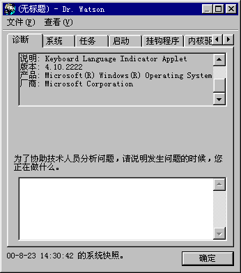 我们平时应用的都是一些较为常用的文件,但是在强大的Win98后台,还有许多鲜为人知的操作,一般我们都不会用到,但当你的系统出现问题时,它们还是很有用的。下面,我就介绍一些。 在 c:\windows目录下,有一个名为Drwatson.exe的文件,是当系统发生错误时,拍下系统快照的诊断工具,它能截取软件错误标识,识别发生错误的软件,而且可以提供错误原因的详细说明。在资源管理器中找到这个文件,运行。当你想检测系统状态时,运行这个程序 ,它会记录下这时的系统状态。你可以通过“标准视图”和“高级视图”,查看系统状态。