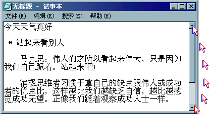| 9、输入汉字(二) 刚才我们已经学会了用鼠标来移动光标,现在我们来看看怎么样使用键盘移动光标。 如果要把光标向左移动,就按这个向左箭头键。 如果想把光标移动到一行的最前面,也就是行首,按这个上面标有Home的键。 当我们输入很多行字后,原来的第一行我看不到了,可以把鼠标指针移动到这个箭头上然后按下鼠标左键,先别抬起来,文字便向下走,如果我们再点向下的箭头,看,文字在向上走。这样我们几可以来回的翻看这些文字了。 我们好像是通过一个窗口来看似的,要看哪个地方就把窗口移动到那个地方。在Windows中我们所看到这些程序画面就叫做窗口。 在我们使用的这个程序“记事本”中,除了刚才使用鼠标单击那两个箭头来上下翻看之外,我们还可以使用键盘的PageUp和PageDown,一个是向上翻页,一个是向下翻页。