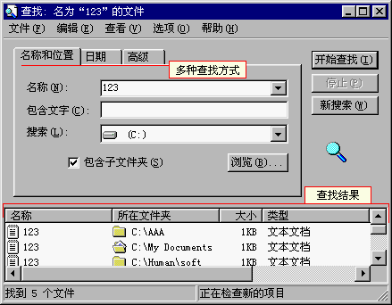 | 22、查找文件和文件夹 弄懂了文件的概念,再学习电脑就非常容易了。硬盘上这么多的文件夹和文件,如果我们要找一个文件,却忘记了它在哪个文件夹里,是不是很可怕? Windows 98特地为我们设置了“查找”功能,可以使我们轻而易举地找到想要的文件或文件夹。 在资源管理器中,单击菜单栏上的“工具”,选择“查找”。此时在屏幕上出现一个查找文件的对话框。在这个名称栏里输入要查找的文件名,在这里选择要在哪个盘上查找,再单击“开始查找”按钮,系统就会在电脑中搜索文件了。 如果找到了,这里就会列出文件名及所在位置,您就可以根据自己的需要操作了。 可是很多情况下,我们并不能记得这么多的文件名,那我们该怎么办呢?没关系即使您记不全文件名,只记得一部分也可以进行查找,电脑会把文件名包含这部分的所有文件都找出来列出来。您再从里面找就好找多了。 而且,在“查找”的时候,可根据文件名、目录、文件修改日期、文件大小、文件关键字等各种信息组合查找。
