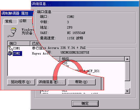 | 10、怎样安装MODEM驱动(三) 现在列出了好多种MODEM的型号,在选择之前,要搞清楚我们的MODEM是那一种型号的。 MODEM上写的型号是:Hayes Accura 336 V.34 + FAX。从列表中找到这一项,然后选择它,再单击“下一步”。 选择MODEM使用的端口,我们是将MODEM连接在COM2口上的,选上它。正在安装MODEM。 这一步是要建立我们自己的位置信息,先输入区号,比如北京是010,如果电话是分机,还要输入外线号。 看,提示已经成功的安装了MODEM,单击“完成”。在列表中已经出现了刚安装的MODEM。 安装完毕后,我们还可以检查一下,是否安装成功了。有个很简单的办法,打开旁边的“诊断”。选择端口COM2,再单击“详细信息”。开始和MODEM进行通信了。出现这个窗口时就表示已经安装成功了。