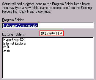 | 18、怎样安装应用软件(三) 现在看到的这个窗口是NetScape的桌面设置选择,也就是说安装了NetScape后,桌面上将有些变化。我们可以都选上了。 这是要在开始菜单中创建程序组,很多的软件在安装时都有这样的提示,而且它们长的样子也很相似,如果你愿意的话,可以给它重新取个名字;单击“Next”[下一步]。 窗口中列出了安装时的信息。这是安装的类型“Typical”[典型],这是要安装的组件,这是安装目录,最后是要新建的程序组名称。如果你对上面某一项还不够满意的话,可以选择“Back”[返回],返回到前面的步骤进行修改,如果没有意见就单击“Install”[安装], 终于开始复制文件了。安装过程看上去麻烦了一些!